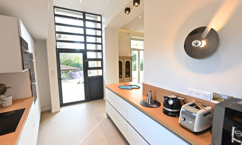 Au rez-de-chaussée, ouverture du mur porteur entre le salon et l’extension cuisine afin de créer un espace ouvert et un îlot. Changement du mobilier de la cuisine.
